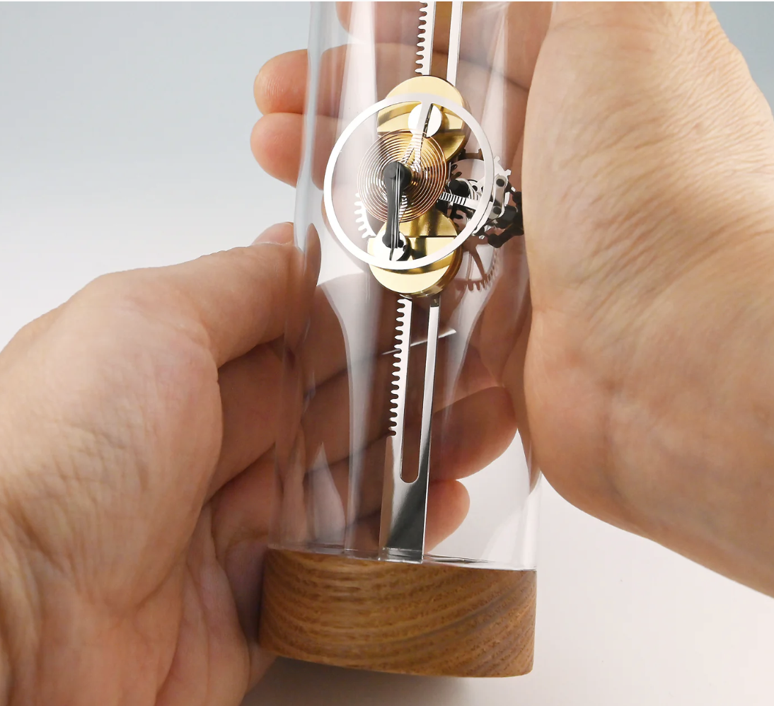It is a unique device that not only functions to measure time, but also allows the user to feel the flow of time through movement, sound, and vibrations like a faint heartbeat. In addition, it is designed to be minimalist to appreciate and enjoy the beauty of the mechanical clock construction itself, made available to be viewed from various angles of 360 degrees. When you have the chance, please take a close look at the series of movements that are beautifully linked by the coordination of each component. Then pick it up and flip it over to feel the intricate ticking rhythm closely resembling the soft heartbeats of a living creature.